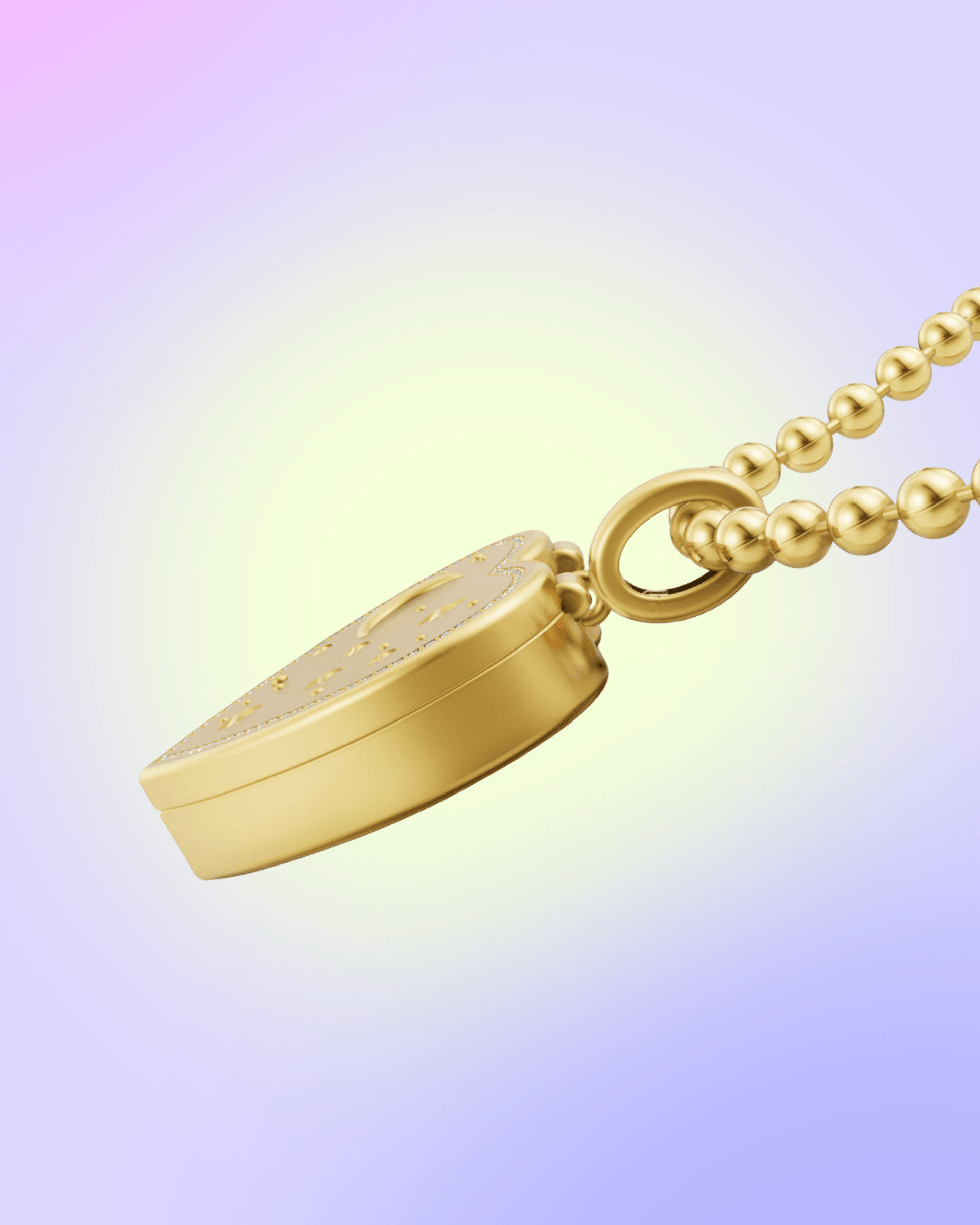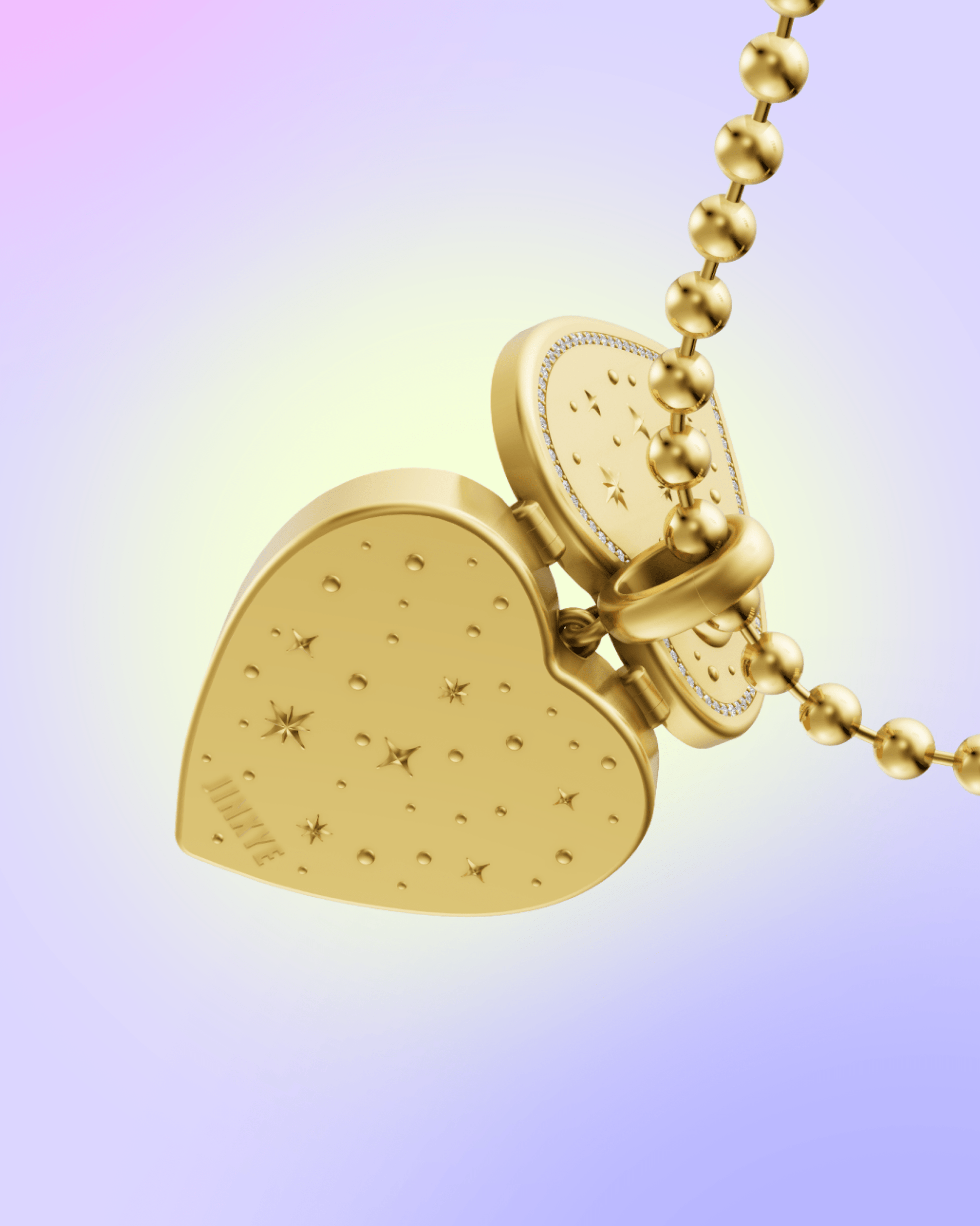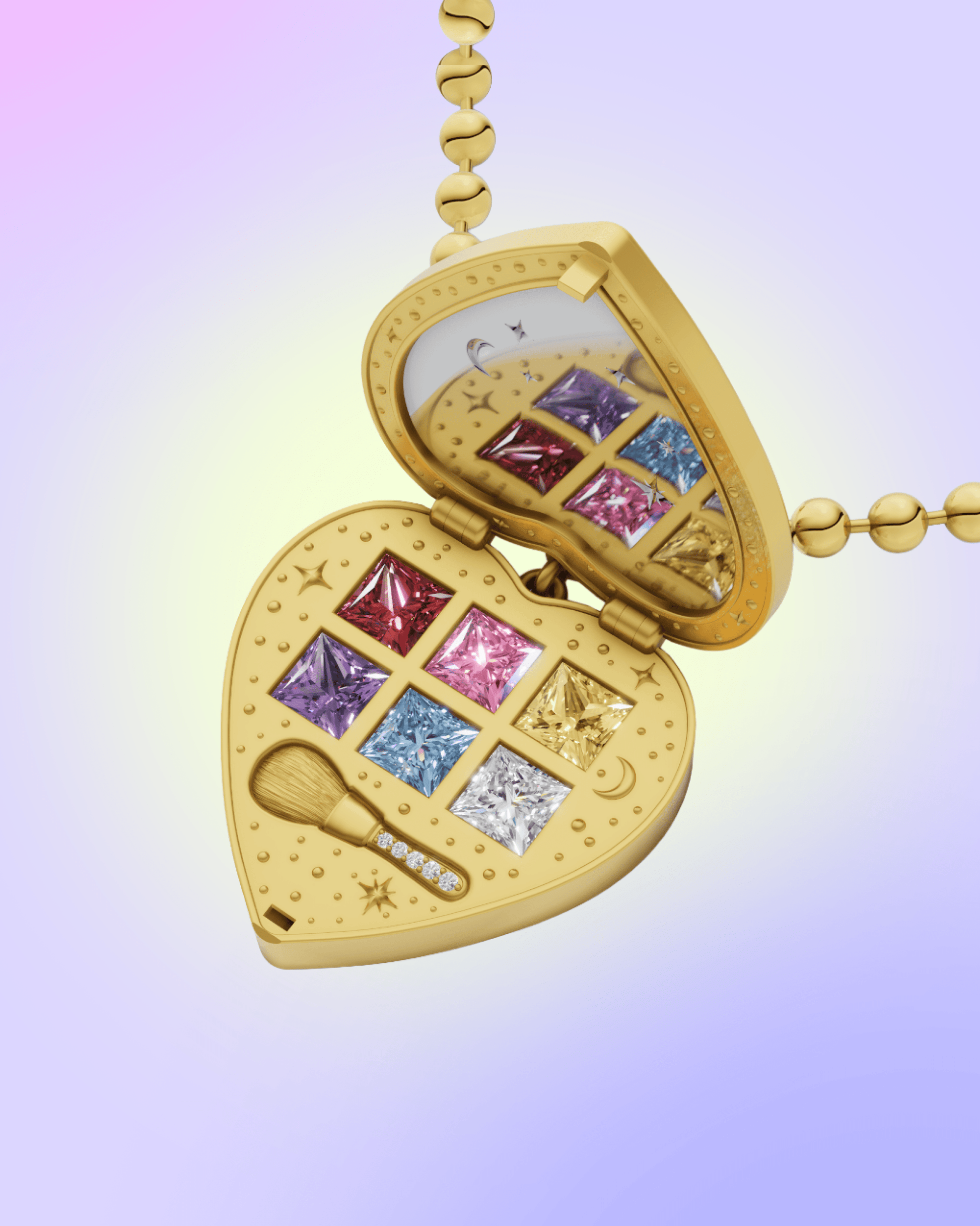 Handcrafted in 14k gold, this heart-shaped treasure opens like a secret universe, revealing six kaleidoscopic sapphire “eyeshadow” gemstones that shimmer like constellations in motion. Each sapphire reflects the radiance you already hold—the quiet brilliance of your own universe waiting to be seen. The outer shell, dusted with diamonds and cosmic stardust, embodies transformation, illumination, and the endless beauty of becoming.